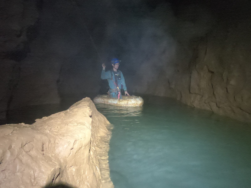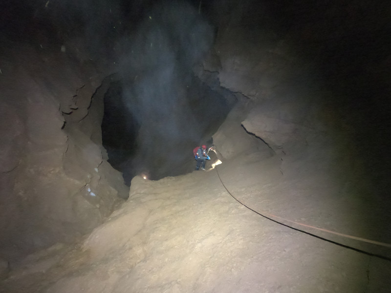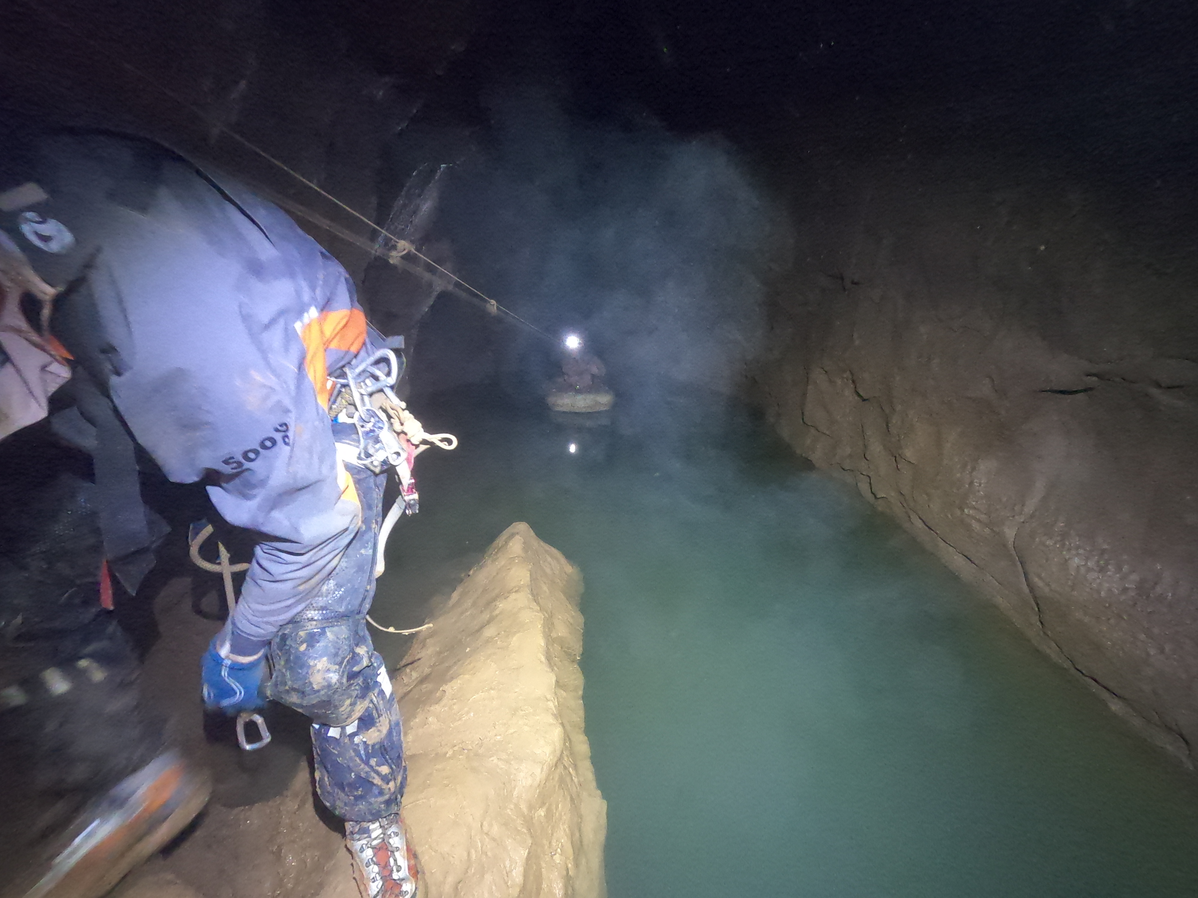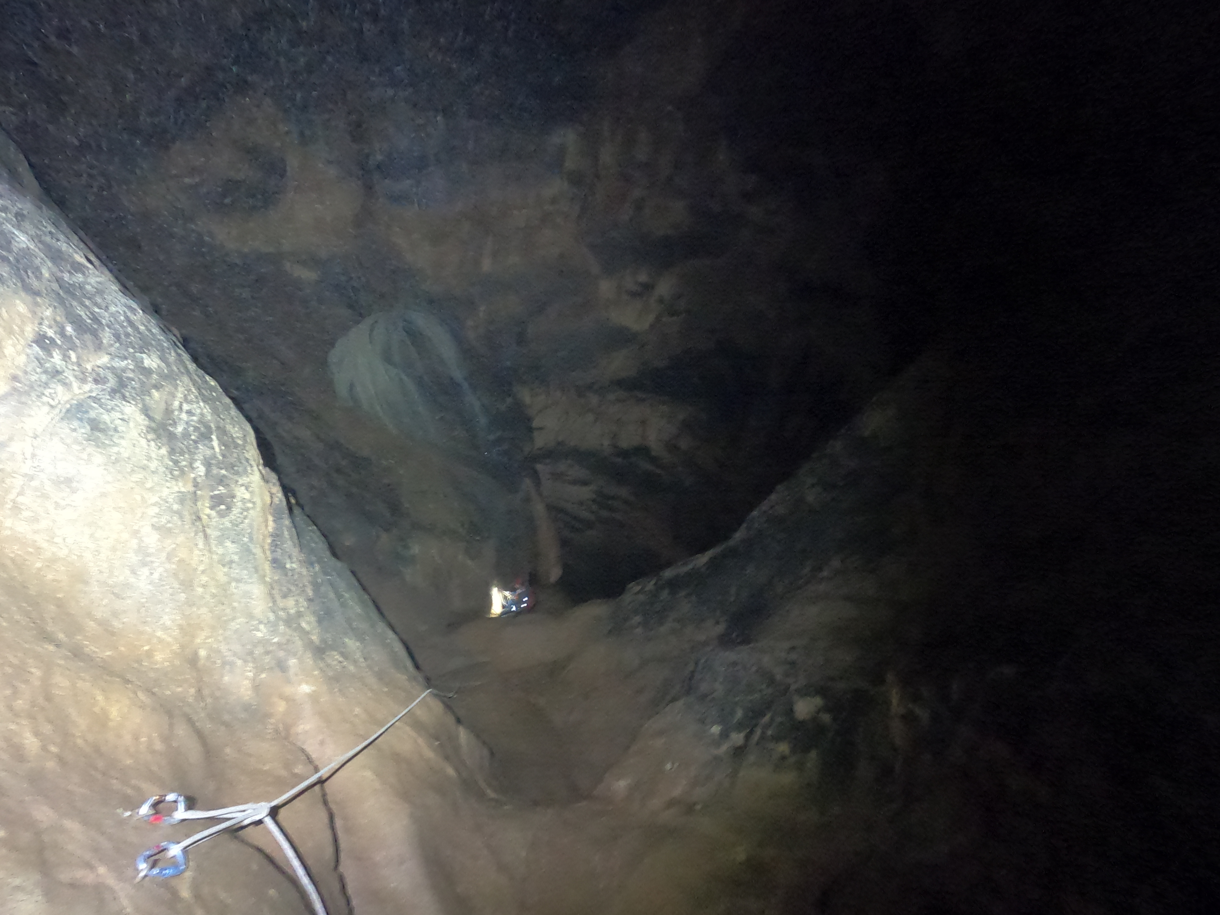 Puits de 50m à l'entrée, puis successions de plans inclinées pour descendre jusqu'au lac à -227m