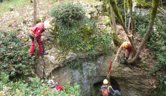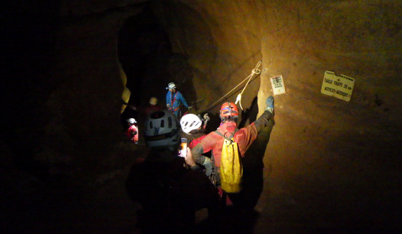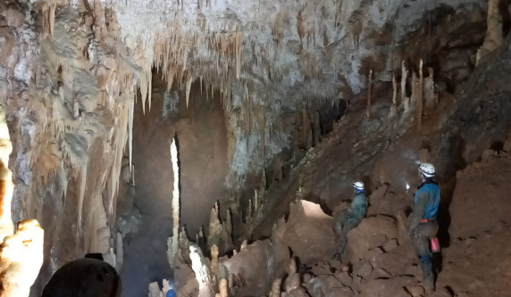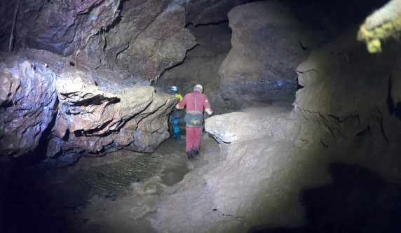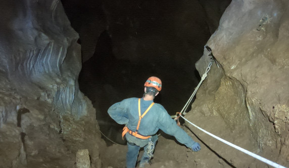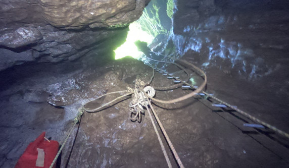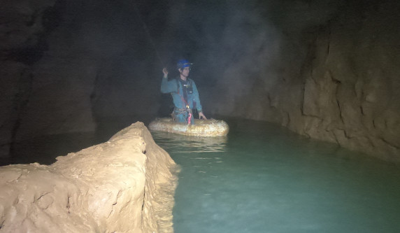 Plus de photosL'igue commence par un puits de 40m suivi d'un méandre qui donne un accès surplombant la rivière souterraine. L'exploration continue par une autre galerie, accessible en main courante, qui donne accès à un grand réseau horizontal.